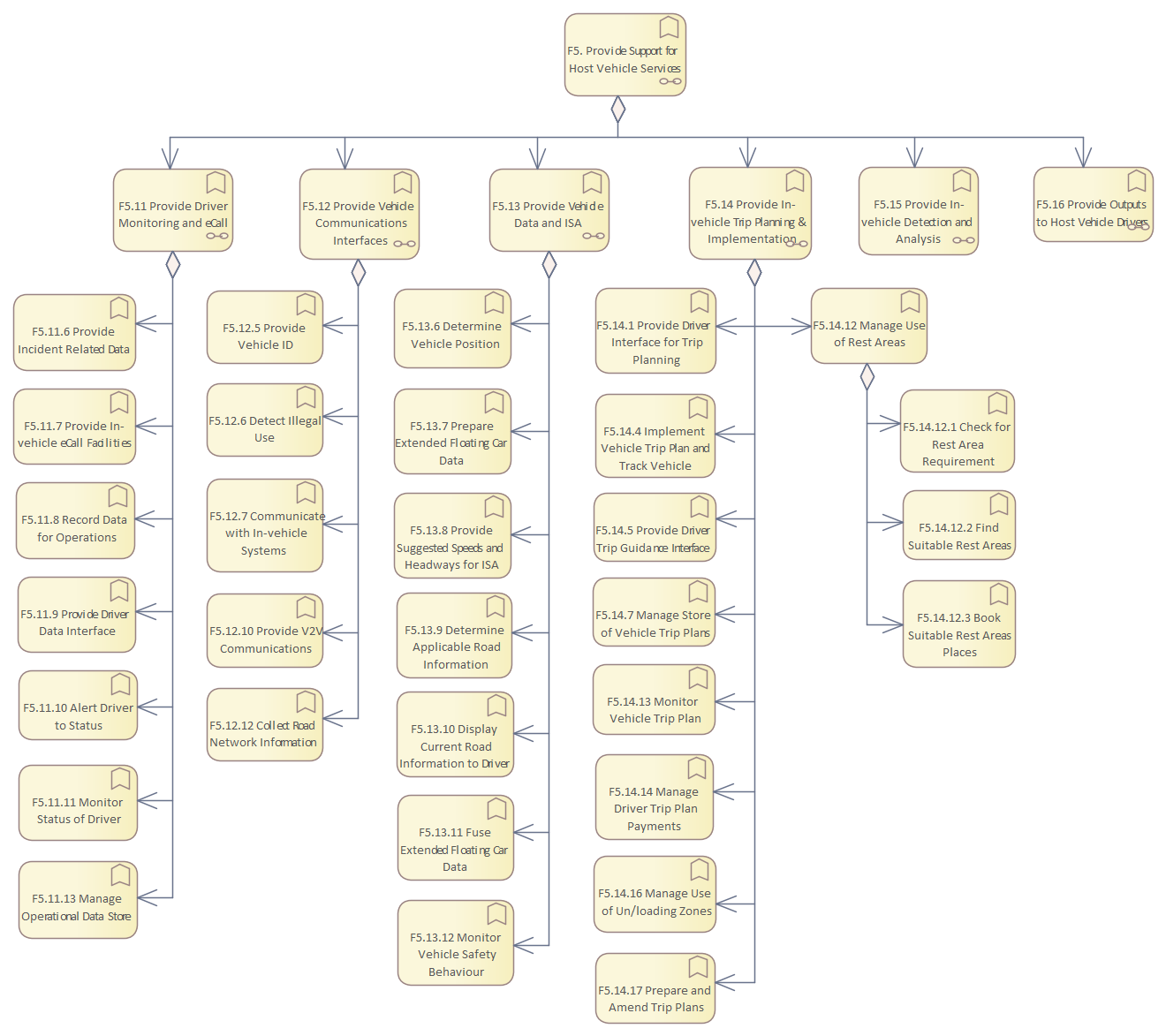 Frame Repository / Frame Functional View / Functionality / Functional Area F5 - Provide Support for Host Vehicle Systems / Functional Tree of Area F5 Provide Support for Host Vehicle Services