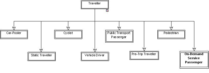 It shall be possible for the services to be available to these Actors through modes such as Public Transport, private car, cycling and walking. Travellers shall also be able to use other non-road based modes of transport through the interfaces provided by other terminators. Prior to a trip, the Pre-Trip Traveller Actor is used. Once Travellers embark on a trip they may become a Cyclist, a Driver, a Passenger or a Pedestrian depending on the mode(s) used between the origin and destination of the trip. When waiting at a Public Transport Stop, the Static Traveller Actor is used.
