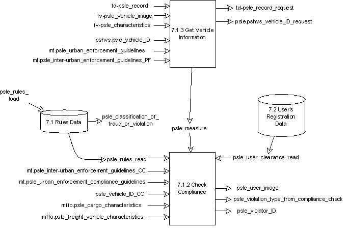 These two Functions collect vehicle identities and check to see if a violation has occurred. The two Functions are linked by a single Data Flow and also have single Data Flows that enable them to read data from Stores. Several Data Flows are provided for the exchange of data with other Areas. The Functions and Data Flows are contained in the DFD for Function 7.1 - DFD 7.1.